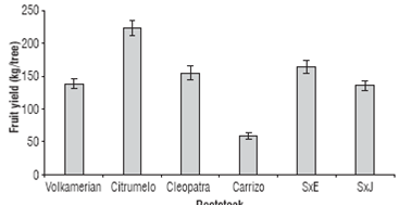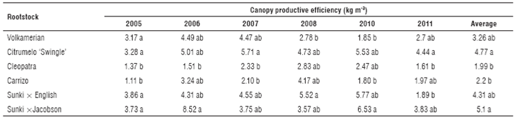 The rootstocks with the highest productive efficiencies obtained, allow plantation of higher plant densities and the obtaining of a better yield/ha, this was the case of SxJ that also had the lowest canopy volumes (58.8 m3) in 2011 showed the best productive efficiency per year with 5.1 kg m-3 overpassing 'Cleopatra' with more than 100 m3 of canopy that can only produce 1.99 kg m-3 per year. Trees grafted onto rootstocks that generate canopies with lower volumes and high productive efficiencies, as was the case of SxE, SxJ and 'Swingle' citrumelo, allow plantations with better densities and increased production per area and reliability of soil use.