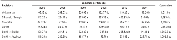 The third place in cumulate yield was obtained by Sunki x Jacobson, with 1,092.8 kg/tree in six harvests without statistical differences with SxE. 'Arrayana' tangerine shows a medium yield when grafted onto 'Volkamerian' lemon and 'Cleopatra' tangerine; this rootstock yielded close to 1,000 kg/tree for six evaluated harvests; in this group was SxJ. The lowest cumulative yield of six harvests was obtained by 'Carrizo' citrange, with 385 kg/tree.