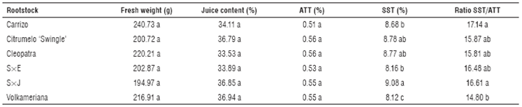 The juice content showed no differences between the rootstocks, 'Volkamerian' was the rootstock that produced the best percentage of fruit (36.94%) and the lowest was 'Cleopatra' (33.53%). The rootstocks did not influence the total titratable acidity (TTA). On the other hand, the highest total soluble solids (TSS) content was obtained by SxJ followed by SxE, and the lowest value was observed in 'Volkamerian'.