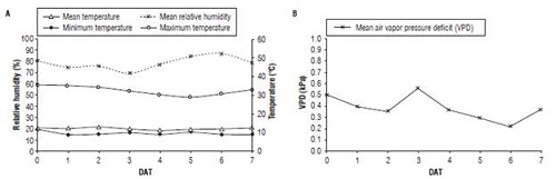 During the experiment period, the minimum air temperature was between 9.7°C and 12.8°C, and the maximum temperature was between 31.3°C and 38.5°C; the mean temperature was between 18.6°C and 20.6°C. The mean relative air humidity oscillated between 69.4% and 89.3%; the mean minimum and maximum relative humidity values were 44.2±10.20% and 98.8±1.6%, respectively (Fig. 1A). During the evaluation period, the VPD varied between 0.30 kPa and 0.50 kPa (Fig. 1B).