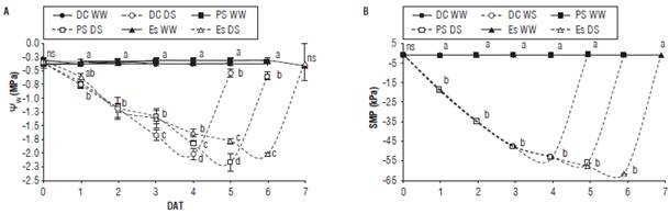 Leaf Ψw was significantly different (P≤0.01) between the WW and the DS cultivars from 1 to 6 d after treatment (DAT) and between the DS cultivars from 3 to 6 DAT (Fig. 2A). From 2 DAT, a significant decrease in the leaf Ψw was recorded in the DS cultivars. A leaf Ψw close to -2.00 MPa was observed at 4 DAT for DC (-1.99 MPa), at 5 DAT for PS (-2.15 MPa), and at 6 DAT for Es (-2.00 MPa). One day after recovery, the DC and PS cultivars showed a significantly lower leaf Ψw (-0.46 MPa and -0.51 MPa, respectively) compared to the WW cultivars (-0.28 MPa and -0.23 MPa, respectively), while Es had leaf Ψw values equal to those of the WW cultivars (-0.26 MPa) (Fig. 2a). The leaf was significantly different (P ≤ 0.01) between the WW and DS cultivars, from 1 to 4 DAT; however, there weres no significant differences between WW cultivars at any day. The SMP was reduced from 1 DAT and reached the most negative values in the DC (-54 kPa), PS (-56 kPa), and Es (-61 kPa) cultivars at 4, 5, and 6 d, respectively (Fig. 2B). However, after 1 d of recovery, the SMP of DS treatments reached the value of WW treatments (-0.00 kPa). Analyzed together, these results indicate the plants of the three cultivars experimented water deficit at different times, which decreased the leaf Ψw to values associated with water stress in plants.
