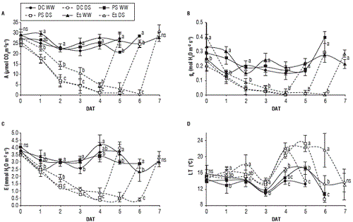 LT showed the significantly higher values in the DS cultivars at 2 DAT for plats of Es (18.01°C) and at 3 DAT for all cultivars (Fig. 3D). The maximum values for the DC (21.48°C) and PS (23.19°C) cultivars were recorded when the lowest leaf Ψw values were reached, while in the Es cultivar the maximum value was observed at 5 DAT (22.29°C). One day after recovery, the LT for the three cultivars reached the values of the WW cultivars (9.53-14.02°C). These results indicate that in the three cultivars under DS, there was a gradual stomatal closure which was higher when the plants reached a leaf Ψw close to -2.00 MPa, and this decrease in stomatal conductance reduced the CO2 input for photosynthesis as well.