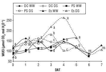 WUEi in the DS cultivars was significantly higher at 3 DAT for PS (181.37 μmol CO2 mol-1 H2O) and Es (218.09 μmol CO2 mol-1 H2O) and at 4 DAT for Es (261.52 μmol CO2 mol-1 H2O) compared with the plants of WW cultivars (Fig. 4). These results showed that the PS and Es cultivars subjected to water deficit have a higher WUEi, which could be related to drought tolerance.