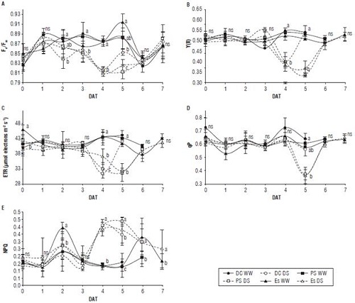 Fv/Fm has been widely used to detect stress-induced alterations in the photosynthetic apparatus (Zegada-Lizarasu and Monti, 2013). In this study, we found that Fv/Fm recorded values greater than 0.80 for the DS and WW cultivars (Fig. 5A). Y(II) and ETR presented significant differences between the WW and DS cultivars at 4 DAT and 5 DAT (Fig. 5B, C). The DC and PS cultivars presented the lowest values for Y(II) and ETR when they reached the lowest leaf Ψw, while the Es cultivar presented the lowest value for both parameters 1 d before reaching the lowest of leaf Ψw One day after recovery, the three DS cultivars did not show significant differences in Y(II) and ETR compared to the WW cultivars. qP exhibited a significant decrease in Es (0.37) and PS (0.37) cultivars at 5 DAT; during the other days (from day 1 to 4), qP did not show differences between the WW and DS cultivars (Fig. 5D). NPQ was significantly higher in DS cultivars at 4 DAT and 5 DAT, with the highest value in PS (0.44) at 5 DAT (Fig. 5E).