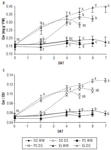 Chl for Es cultivar under DS was significantly higher from 5 to 7 DAT compared to WW plants (Fig. 6A). For the other cultivars, there were no significant differences in Chl between the plants under DS and WW. The Car presented a significantly higher value in DS cultivars from 2 DAT for DC and Es and from 4 to 6 DAT for PS compared to WW plants. From 4 DAT, Es presented the highest values for Car content (0.36-0.40 mg g-1 fresh weight [FW]), while DC presented the lowest values at 5 DAT (0.27 mg g-1 FW) (Fig. 6B). The Car/Chl ratio was higher for DS plants (Fig. 6C); the ratios increased from 2 DAT for DC and Es and from 4 DAT for PS. These results suggest that the three varieties exhibit a strong photoprotective system against water stress.