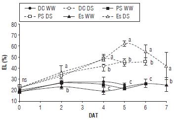 The DS cultivar plants presented a significant increase in EL from 2 DAT (Fig. 7). The Es cultivar presented the highest values at 5 DAT and 6 DAT (62.36 % and 55.29%, respectively). One day after recovery, none of the DS cultivars reached the EL values of WW plants (Fig. 7). These data suggest that the three DS cultivars exhibit an increase in membrane permeability, although this increase was higher in the Es cultivar.