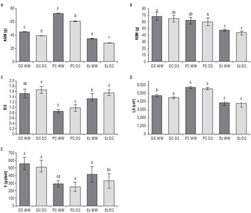 ABG was significantly greater in WW plants across all cultivars (Fig. 8A), while for the RDM there were no significant differences between the DS and the WW cultivars (Fig. 8B). Regarding the R/S, the DS Es cultivar presented a significant increase (1.5) due to a lower ABG compared to the analogous WW cultivar (1.3) (Fig. 8C). The LA did not show differences between the DS and WW cultivars (Fig. 8D). There were no differences in Y between the DS and WW cultivars (Fig. 8E). Taken together, these data suggest that the three cultivars were tolerant to the drought stress.
