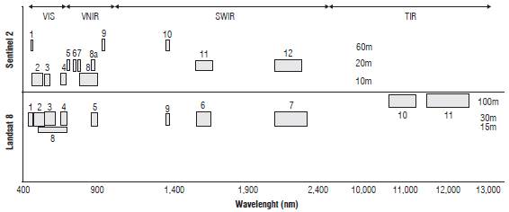 Sentinel 2 and Landsat 8 images from the dry season (January 17, 2016, less than 5mm precipitation) and the wet season (June 25, 2016, more than 189 mm precipitation) were used. SENTINEL-2 is a wide-swath, high-resolution, multi-spectral imaging mission, launched by the European Space Agency (ESA) in June 2015, it takes images in 13 spectral bands (Fig. 1); four bands at 10 m, six bands at 20 m and three bands at 60 m spatial resolution. ESA took the first images in the study area in December 2015. Sentinel 2 data have some advantages when compared to Landsat 8 satellite (Fig. 1) operated by NASA, launched in February 2013, taking images in bands 1, 2, 3, 4, 5, 6, and 9 with a spatial resolution of 30 m, bands 10 and 11 with resolution of 100 m and panchromatic band 8 with 15 m. Several analysis were performed in the Sentinel 2 images using the software QGIS (Congedo, 2016) and different spectral vegetation indexes and REP values were calculated (Tab. 1).