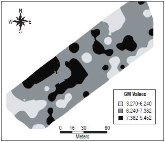 An important aspect on which permanent crop information is required is spatial variability at the detailed level within the lots in order to determine differential doses of inputs to be applied, to estimate yields or to perform differential management. Figure 9 shows the spatial distribution of GM calculated from reflectance measurements with the FieldSpec spectroradiometer within a maize crop,. Although at first glance in the field, it appears to be a relatively uniform crop, it presents high spatial variability associated with variations in the soil characteristics. This variation in the status of the crop affects production and can be modeled from spectral response data. In the case of Sentinel 2 images, when crops are relatively large, differences can be seen within cultivated lots; this aspect should be investigated in order to establish how much utility the images could have to evaluate spatial and temporal variability at the interior of each cultivated field.