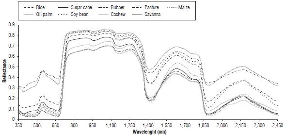 Figure 2 shows the spectral responses of some crops measured in the wet season with the FieldSpec4 spectro-radiometer. Significant differences in reflectance can be observed, mainly in the spectrum range of 530-560 nm, corresponding to green. The natural savanna vegetation and established pastures had the highest reflectance values in this portion of the spectrum (0.47), while crops, such as rubber, cashew, oil palm, and soybean, had the lowest values (around 0.1). Differences in reflectance were also observed in parts of the NIR (near infrared) and in the SWIR (Short-wavelength infrared). According to Liang (2004), the response in the visible spectrum is largely due to the amount and type of chlorophyll and carotenes; while in the NIR, it is mainly due to characteristics of the leaf structure and in the SWIR is most related to water content. This relationship between the spectral response and the content and type of pigments mainly chlorophyll and carotenes is the basis for calculating indices to establish the state of the plants related to nutrition status or other type of stress from the spectral responses. The relationship between chlorophyll and N is the basis for estimating N content in leaves from spectral responses (Cao et al., 2014).