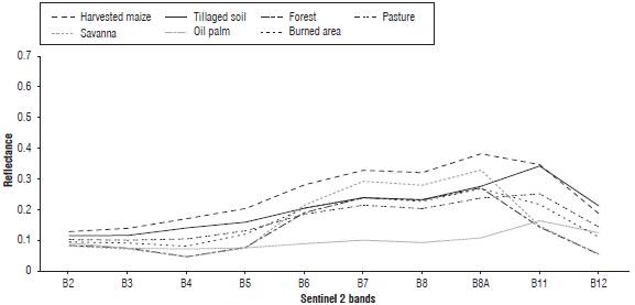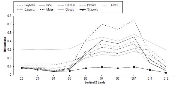 Figures 3 and 4 show the spectral signatures of some crops and land-covers obtained from Sentinel 2 images (only those that were present in the same site and in the two seasons are shown). In the dry season, there was a higher reflectance in the visible range of spectrum (bands 2, 3, and 4) compared to the wet season because the plants were generally less green, with a lower moisture content and with less chlorophyll, leadin to lower energy absorption and greater reflection. In the following parts of the spectrum (bands 5, 6, 7, 8 and 8A), higher reflectance values were present in the wet season compared to the dry season. These changes are important at the moment of the classification of the Sentinel 2 images. When comparing the spectral signatures measured with the spectroradiometer (Fig. 1) and those obtained from Sentinel 2 images (Figs. 2 and 3), it wass found that measurements with the spectroradiometer showed a very narrow peak at 550 nm that corresponds to green, while in the images such peak is not detected. This is due to the higher spectral resolution of the readings of the spectrophotometer that takes values every 1.4 nm; while in Sentinel 2 images, the reflectance in the green is represented by a single value in a range of the spectrum whose central value is 560 nm and the bandwidth is 35 nm. This is important since it influences the accuracy of the information that can be generated from the images mainly referred to phenological characteristics and nutritional state of the crops.