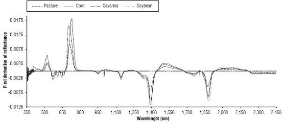Figure 6 shows the behavior of the first reflectance derivative in the range of the second peak observed in figure 5, between 660 nm and 780 nm. REIP values, corresponding to the maximum value of the first derivative in this portion of the spectrum, varied between 0.01 for pastures and 0.017 for maize and were located at wavelengths ranging from 700 nm for grasses to 728 nm for sugar cane, the other crops and land covers presented intermediate values. There was also variation in the shape of the peak, from very sharp for the studied crops and larger for the established grasses and for savanna. Based on these results, it was found that the plants with lower contents of N had lower values of the first derivative, performed larger peaks and were located close to 700 nm; while those with higher contents of N had higher values, REIP was closer to 725 nm and generally had a sharper peak.