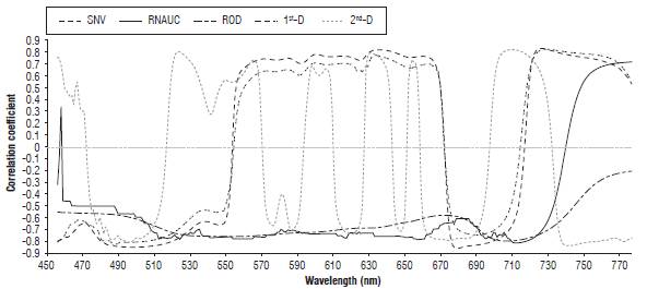 The correlation analysis showed highly significant coefficients between the N content in the leaves and the values of the reflectance in the wavelengths range of 450 nm and 780 nm (Fig. 8). However, the correlation was higher when the reflectance was transformed by the state normal variate reaching the highest values in the range of 490 nm to 505 nm with r of -0.86 and from 681 to 685 with r of -0.87. There were also highly significant correlations between the content of N in the leaves and the values of the first derivative of the reflectance between the wavelengths of 478 nm and 780 nm, with the highest coefficients in the range of 730 to 732 nm, where r was 0.84 and between 495 nm and 496 nm with r of -0.81. The second derivative and the N content, also showed highly significant correlations in parts of the spectrum (Fig. 8), with higher values between 523 and 526 with r = 0.82 and in 743 and 744 nm with r = -0.84. It has been found that the peak of the first derivative that is close to 700 nm increases when the Nitrogen content in the plant decreases (Chen et al., 2010). Changes in the first reflectance derivative indicated changes in the chlorophyll content in maize, winter wheat, sugar beet and wild vine crops (Kochubey and Kazantsev, 2007), which have also been used to determine the effect of glyphosate on plants (Yao et al., 2012).