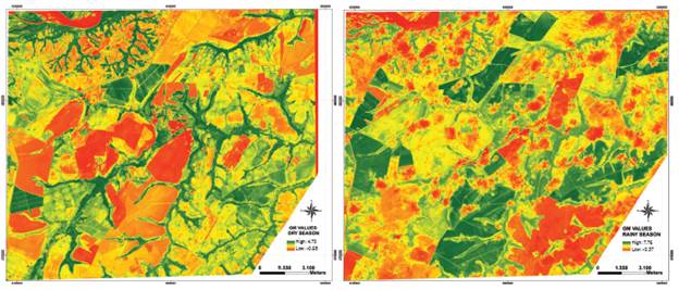 Figure 9 shows the Green Model index (GM) calculated from the band 7 corresponding to part of the red-edge (783 nm) and band 3 to the green (560 nm) of Sentinel 2 for the wet and dry seasons. Lowest values of GM correspond to areas without vegetation (dark red for river-bed or bare soil), higher values (dark green) represent the most developed vegetation or higher density of land cover like oil palm crops or forest, and between these extreme values, different crops are located. Pastures and savanna (yellow areas) had low values, although they have high density of land cover. Within crop, fields there were found spatial variation of GM values probably due to N content. Results also indicated significant changes in the crops, while some areas in the dry season were bare soil (dark red colors) in the wet season with short period mainly soybeans crops were planted, rice and less maize (dark green), in rainy season clouds could be observed (soft red). Other studies (Immitzer et al., 2016) have emphasized the importance of this kind of images and the availability of several bands in the red edge for crop identification and classification.
