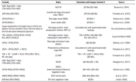 Frampton et al. (2013) based on the simulation of data from Sentinel 2 images, found a significant relationship between chlorophyll contents and leaf area index with NDVI and REP values. These authors concluded that Sentinel 2 would offer a great opportunity for the global monitoring of vegetation because of the improvement of the spatial and temporal resolution in comparison with the Landsat and SPOT images and because of the bands taken around the red-edge, useful for establishing the state of the vegetation and specifically the contents of chlorophyll. They suggest that further research is required to establish the function of the portion of the spectrum corresponding to green (525-555 nm) and its relation to chlorophyll content. The results suggest that the part of the spectrum corresponding to green in these images may not be very suitable for making estimates of chlorophyll (Frampton et al., 2013).