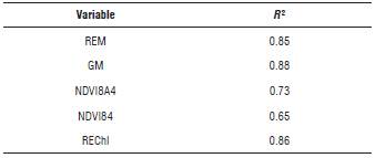 The determination coefficients between some spectral indices computed with Sentinel 2 images and leaf N content are shown in table 3. The highest correlation was presented with the GM although there were also relatively high coefficients with REM and REChI, and lower values with NDVI. This indicates a good potential of Sentinel 2 images to evaluate the nutritional status of the crops, in relation to N, and to be able to see their spatial and temporal variability.