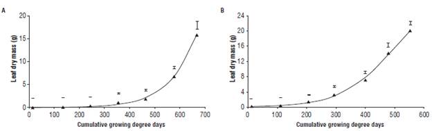 The LAI in the two evaluated cycles had two phases. In the first phase, slow growth was observed until 8 and 15 dat for the first and second cycle respectively; later, accelerated growth was observed until 45 dat, with a maximum value for the first cycle of 8.06 and, for the second one, 10.38, the latter value being the highest LAI (Fig. 2D).