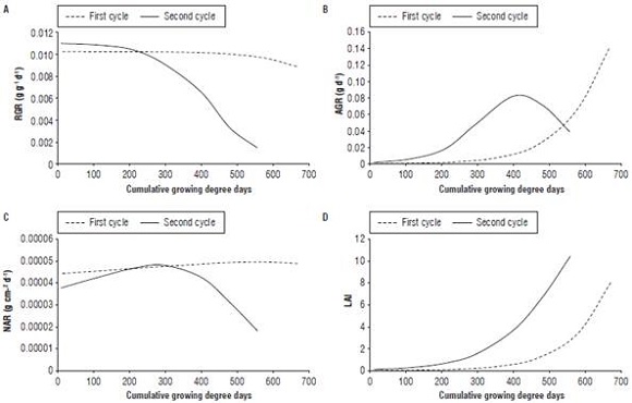 In the two evaluated cycles, the NAR presented an increase up to 22 dat; the first cycle had a maximum value of 0.00080043 g cm2 d-1 and the second one showed a value of 0.00082182 g cm2 d-1, then began to decrease until 43 dat, just when the vegetative cycle ended (Fig. 2C). Generally, the decrease in NAR was associated with increased foliage in the plants, making the intercepted light lower (Evans and Poorter, 2001).