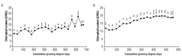 According to Ázcon-Bieto and Talón (2008), nitrogen is important in the formation of chlorophyll since it is part of the cyclic tetrapyrrole ring, linked in the center with a metallic magnesium cation. When there is an absence of this nutrient, apart from having a deficiency, there is a decrease in the content of chlorophyll, affecting the photosynthesis process (Peláez et al., 2010). In leaves, it is very important to quantify the chlorophyll because, when it degrades, the leaves change color from a bright green to brown, or other colors (yellow, purple and orange); these color changes mean a loss of quality in the products (Lin et al., 2013).