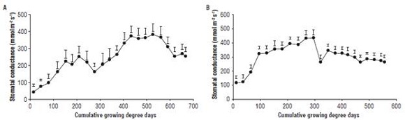In beet, spinach, tomato and pea plants, when stomata are open, values ranged between 200 mmol m-2 s-1 to 800 mmol m-2 s-1 and when closed, they have low values of 4 mmol m-2 s-1 (Angeles, 2014). When there is a reduction in the SC, it is because of the stomatal closure, which can be caused by several factors, including light, humidity, CO2, temperature and air currents (Haworth et al., 2016). Stomatal closure diminishes the CO2 intake, which inhibits photosynthesis and generates a reduction of photosynthesis (Kawasaki et al., 2015); similarly, abscisic acid regulates SC decreases, causing stomatal closure, when the mesophyll begins to suffer dehydration.