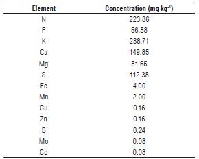 The nutrient solution was prepared based on the mg kg-1 concentration proposed by FAO and HEWIT (Gilsanz, 2007). The sources used were potassium nitrate, calcium nitrate, urea phosphate, magnesium sulfate and minor nutrifeed® as a source of minor elements. The concentration in mg kg-1 used in the test can be seen in (Tab. 1). pH monitoring was performed daily with a Hanna HI8424 potentiometer (Hanna Instruments, Woonsocket, RI, USA) and the electrical conductivity was measured every 4 d with an Oatkon CON 500 conductivity meter (Oatkon Computing, Australia); 10% KOH was used for pH adjustment.