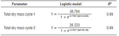 The logistic model was fit to the total mass behavior, presenting a sigmoidal growth in the two cycles (Tab. 3); however, the second cycle developed better than the first, with a final dry mass accumulation of 16.5 g as compared to the first, which had an accumulation of 13.2 g (Fig. 1), these values are similar to those found by Valverde (2013) in lettuce variety Beyonce planted in an NFT system, where it obtained a final average mass of 18.7 g. Possible differences in the dry matter accumulation in the two cycles probably occurred because of pH problems in the nutrient solution of the first cycle, which limited nutrient uptake and plant development.