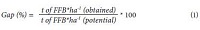 Yield gaps were quantified as the ratio from real yield with respect to potential yield, both expressed in terms of tonnes of fresh fruit bunches (FFB) per hectare; and taken as a percentage, as observed in equation 1 (Eq. 1):