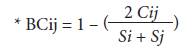 where CijCij is the sum of the lesser values for only those species in common between both sites, while Si and SjSi and Sj are the total number of specimens counted at both sites (Silveira-Neto et al., 1976; Johnson, 1980; Ramirez, 2006; Zamar, 2011; Yara and Reinoso, 2012).
