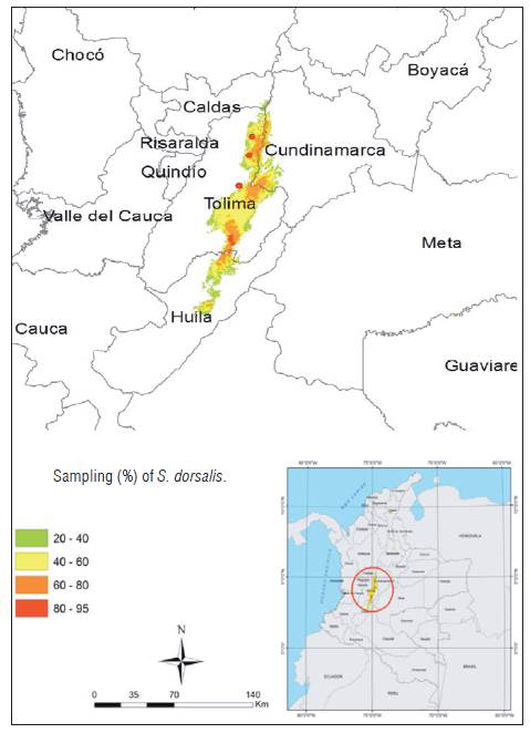 The geographical context of this study corresponded to the Andean region, the Magdalena warm valley in the departments of Huila, Tolima and Cundinamarca. The research area presents an altitudinal range below 600 m a.s.l., characterized by tropical dry forest vegetation (bs-T) (Holdridge, 1967; IAvH, 2014). Farms were inspected in the municipalities of Villavieja, Campoalegre (Huila); Venadillo, Natagaima, Ambalema, Lerida, Armero, Espinal (Tolima) and Ricaurte (Cundinamarca) (Fig. 1).