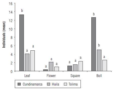 Thrips S. dorsalis are small insects (<1 mm in length), with thigmotactic behavior and similar morphology features as other thrips species (Kumar et al., 2011). It is a species of great economic importance in the world, which was registered for the first time in Colombia in 2010 (ICA, 2012). Due to this, it is necessary to evaluate the potential and actual phytosanitary impact of the species at regional and national levels. The objective of the present study was to determine the infestation and preferences of S. dorsalis for the structures of young leafs, floral buds, flowers and bolls (fruits) in cotton plants from the Magdalena warm valley of Colombia.