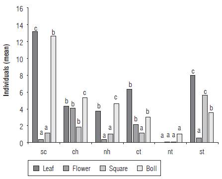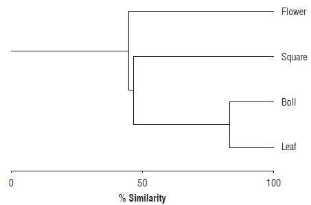 According to the similarity indices (is) applied, significant differences (P<0.05) were found in the abundances of S. dorsalis between structures in the cotton plant: leaf-flower (is = 0.40), leaf-bud (is = 0.71), leaf-boll (is = 0.52), flower-bud (is = 0.24), flower-boll (is = 0.16) and bud-boll (is =0.78). The Bray-Curtis similarity-affinity index showed significant differences between the paired structures flower-boll (Rs = 0.6742; P = 0.01), flower-leaf (Rs = 0.5900; P = 0.006) and boll-leaf (Rs = 0.5277; P = 0.017). However, no significant differences were observed between the paired structures flower-bud (Rs = 0.4244; P = 0.062) and boll-bud (Rs = 0.4037; P = 0.077). The preference analysis based on the abundance of S. dorsalis in the evaluated structures revealed that the species had a higher affinity for the bolls (I = 1.7>1), followed by young leaves (I = 1.3>1) and buds (I = 1.2>1). Opened flowers were not a frequented resource for the pest with a similarity range of I = 0.8 (<1) (N = 60; cophenetic correlation = 0.927; read cases = 60; omitted cases = 0; P<0.05). Paired comparisons using the Z test (P = 0.05) revealed that there were significant differences between boll-flower and young leaf-flower (Fig. 4).