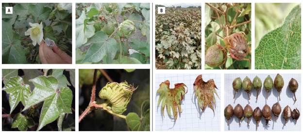 Due to the fact that immature stages of S. dorsalis were found during the sampling performed in the present study, it is suggested that cotton plants constitute true hosts where the species can develop and complete its life cycle (Mound and Marullo, 1996; Marullo, 2004; Marullo, 2009; Vierbergen et al., 2010; Alves-Silva et al, 2013). This result is relevant because there is scarce knowledge about host plants and feeding strategies of the genus Scirtothrips, which has been a barrier for the definition of surveillance and control strategies (Zwölfer, 1983; Lacasa et al., 1996; Mound and Marullo, 1996; Hall et al., 1997; Pérez, 1999; Hernandez, 2005; Alves-Silva, 2013; Kumar et al., 2013; Burckhardt et al., 2014). The specialization in insects corresponds to the general rule and not to the exception (Pérez, 1999; Schoonhoven et al., 2005), so that the recognition of preferences could offer important ethological elements in the differentiation of the species and could also give clarity on their economic importance (Thorsteinson, 1960; Stern, 1973; Zwölfer, 1983; Bernays and Chapman, 1994; Sha et al., 1998; Zamar and Neder, 2012; Cook et al., 2013). In the present study, symptoms such as leaf distortion (leaf curl), leaf wilting, leaf fall, and discoloration of boll and floral buds (bronzing), were attributed to the insect presence in the cotton plants (Fig. 5).