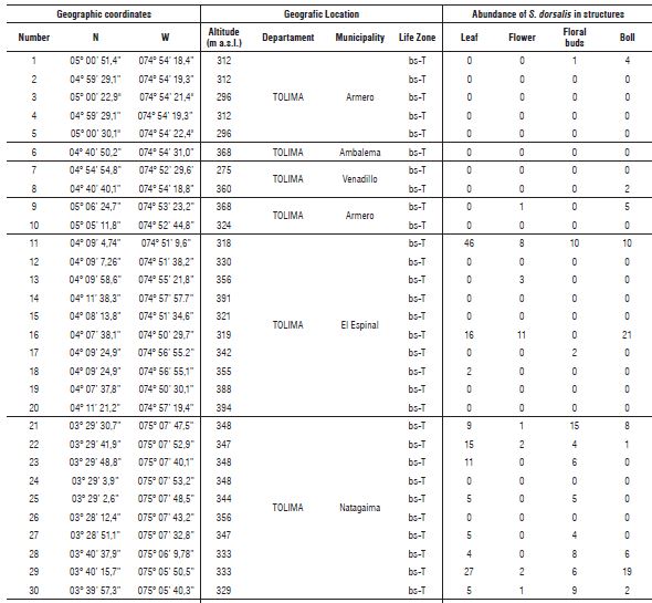 The insect S. dorsalis is an introduced species in Colombia, with a type "r" reproductive strategy and records of polyphagia (Morse and Hoddle, 2006; Rodríguez, 2006; Lieb-hold and Tobin, 2008). All the above, in conjunction with the distribution recorded in the present study, can generate negative effects on biodiversity, uncultivated native flora and other crops of economic interest such as mango, citrus, avocado, tomato, chili and aromatic herbs, which are also established in the Magdalena warm valley in the Andean region of Colombia (Mound and Palmer, 1981; Hoodle and Mound, 2003; Liebhold and Tobin, 2008; Kumar et al., 2011; Kumar et al., 2013; Wegier and Piñero, 2013). It is clear that the introduction and establishment of non-native species affect trophic networks and can alter processes of population dynamics that allow species regulation (Lewis, 1997; Schoonhoven et al., 2005; Gutiérrez, 2006). This fact must be considered as an important risk if the cultivated area is a cotton monoculture.