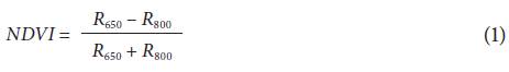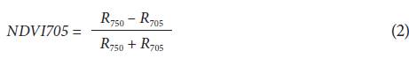 where R650, R705, R750 and R800 are the percentages of light reflected with respect to the calibration blank at wavelengths 650, 705, 750 and 800 nm, respectively (%), and is the first derivative of the reflectance with respect to the wavelength (% nm-1).