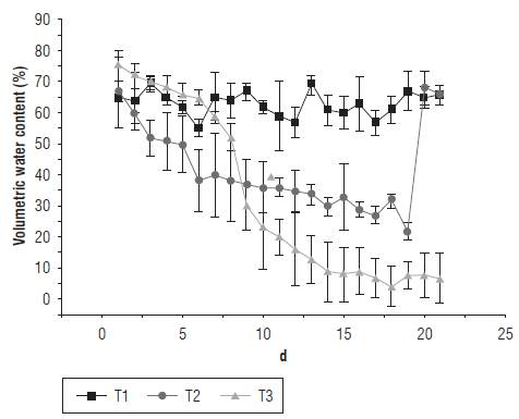 All EU started with the volumetric moisture of the substrate at FC (76% volume content). The substrate moisture was monitored and adjusted three times per week until it reached the values of each treatment T1, T2 and T3. Figure 1 shows the variation of the average substrate moisture (volume-basis) throughout the experiment. On d 19, the moisture of the T2 treatment was restored to 100% FC in order to determine if the changes in the thermal and spectral response of the EUs corresponded to the variation in the irrigation.