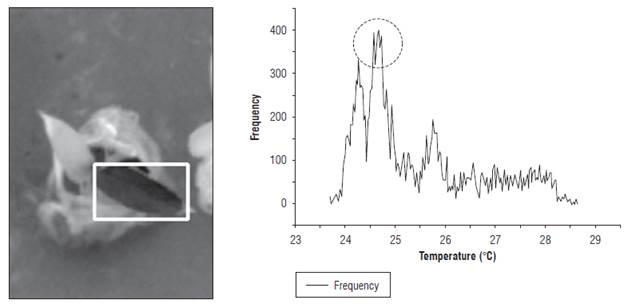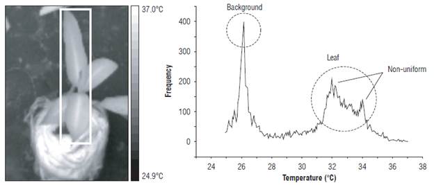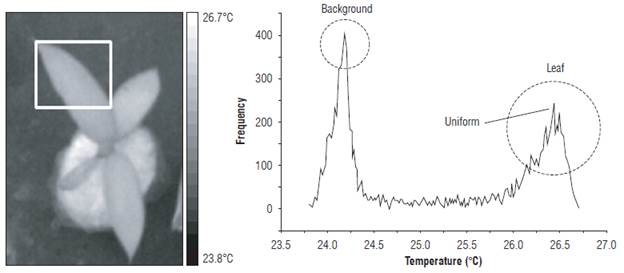 The Twet reference was calculated using the most frequent value of the histogram in the region of interest (ROI). Figure 5 presents the ROI for measurement of the Twet and its histogram. The circle shows the most frequent value of the histogram of the ROI temperature field. Similarly, the leaf temperature of the EUs was estimated with the temperature image.