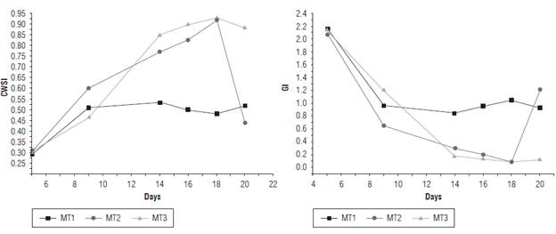The maximum values of the CWSI index were associated with the treatments with a water deficit, which is related to the tendency of leaf temperature to approach the reference temperature, inhibiting the transpiration process. On the other hand, the maximum values associated with the GI were related to the EUs at FC. This corresponds, according to Equation 4, to the tendency of leaf temperature to approach the reference temperature, favoring the process of perspiration. The CWSI went from a mean value of 0.9 for d 18 to 0.45 for d 20, after resetting the moisture of the EUs of T2 to FC. Likewise, the GI went from an average value of 0.1 to 1.2, showing that restoring irrigation in the EUs of T2 favored stomatal conductance and decreased water stress in the plants.