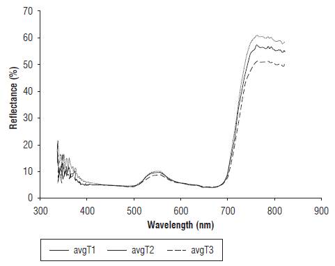 The leaf tissue reflectance of the EUs presented the typical response of plant tissue, in which the percentage reflected in the NIR band (around 800 nm) was higher than the percentage reflected in the visible band (400-700 nm). However, it was found that the NIR reflectance for the T2 and T3 treatments was lower than for the T1 treatment. Changes in morphology of the leaf and the structure of the mesophyll have a strong influence on the spectral properties of leaves in this range (Wójtowicz et al., 2016). Decrease in reflectance in the near infrared could occur because of the structural modification of mesophyll, which is possibly related to a strong water deficit (Semenova et al., 2014). Figure 2 shows the average of the reflectance curves for each treatment at d 14 of the experiment. These results are in agreement with those obtained in other species subjected to a water deficit. In a study with Zea mays L., Genc et al. (2013) found similar results for four treatments (100% FC, 66% FC, 33% FC and 0% FC). In the species Spinacia oleracea under water stress, Corti et al. (2017) reported the same effect of a decrease on NIR reflectance measured on green leaves.
