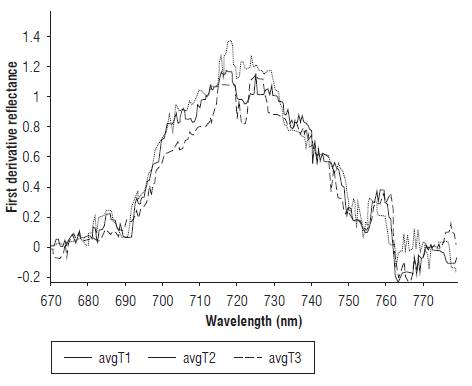 The treatments with a water deficit showed a decrease in the slope between 700 and 750 nm. As a consequence, the maximum value of the first derivative of the reflectance curve (Eq. 3) decreased for T2 and T3. Figure 3 shows the average behavior for d 14 of the measurements in the three treatments.
