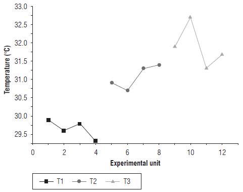The temperature of the leaf tissue was found to increase for treatments with a water deficit (T2 and T3). Figure 4 shows the leaf tissue temperature of the EUs in the three treatments on d 14 of the measurements. The data from 1 to 4 correspond to the EUs of T1, data 5 to 8 to T2, and data 9 to 12 to T3.