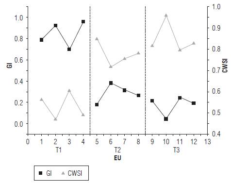 The CWSI and GI showed significant differences between the T1 treatment and the T2 and T3 treatments. After restoring irrigation to FC for T2, no significant differences were obtained between T1 and T2, which shows that the thermal response of the leaf tissue of the EUs was influenced by the irrigation levels (Tab. 2). Figure 6 presents the estimated thermal indices for the thermographs taken for the three treatments on the 14th d of experiment.