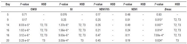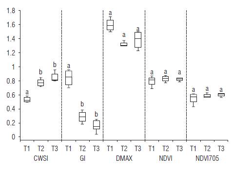 The CWSI and GI made it possible to obtain greater statistical differentiation between the T1 treatment and the T2-T3 treatments than the NDVI, NDVI705 and Dmax spectral indices studied in the 350-800 nm range (Fig. 7).