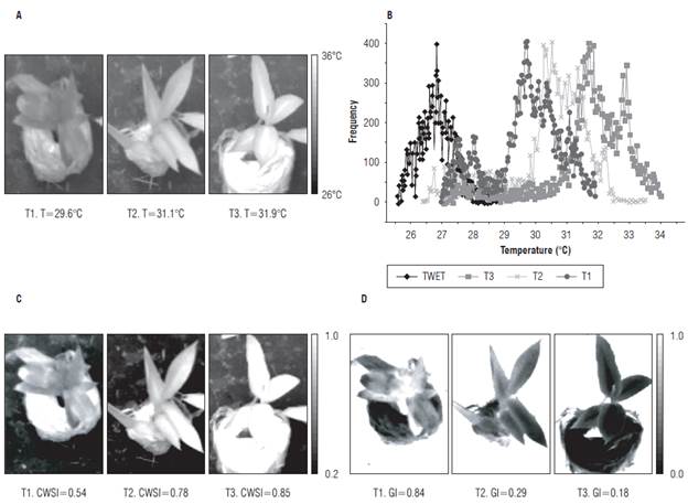 Figure 8B shows the histograms associated with the ROIs of the thermographs shown in Figure 8A, taken on experiment d 14. Information was obtained on the thermal indices of the plant species for each pixel associated with the leaf tissue of the EUs using Equations 4 and 5, whose gray level is proportional to the value of the index in each pixel (Fig. 8 C and D).