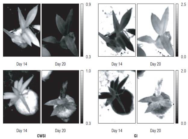 The CWSI and GI were successful indicators of the effect on transpiration caused by the water status of the He species. The thermal response in the leaf tissue, when faced with variations in the water status was not uniform for the He species. The imaging technique was, therefore, a valuable tool because it provided sufficient spatial resolution to evaluate the response of the plants.