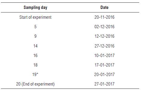 This experiment was carried out in a greenhouse located in the Experimental Station of the Agricultural Water and Soils Laboratory of the Universidad del Valle, Cali, Colombia, where the variables ambient temperature and relative humidity were monitored (average temperature of 24.5°C, 79% relative humidity, and 30% poly shade). Young individuals of the plant species Heliconia psittacorum (He), not more than 0.15 m tall, were taken from a sub-surface wetland of horizontal flow from the was-tewater treatment plant of Ginebra-Valle, Colombia. The plants were acclimated for two months under saturated substrate conditions. The experimental design was completely randomized with one factor (irrigation). Three levels of the irrigation factor were established (100% Field Capacity (FC), 50% FC and 10% FC). The FC value of the substrate was estimated using the sand box method (Jaramillo, 2002). Three treatments were performed with 4 replicates and 12 experimental units (EU). Each EU was an individual of the He species planted in 6 L pots with the substrate, which provided nutritional support, composed of soil with organic fertilizer, to which macro and micronutrients were added according to the requirements of nitrogen, phosphorus and potassium reported by Sosa (2013). Tests of analysis of variances (ANOVA) and Honestly Significant Difference (HSD) of Tukey (P<0.05) were used prior to the normalization and verification of homoscedasticity to determine if there were significant differences between the treatments. The experiments began on November 20, 2016 and ended on January 27, 2017. Statistical tests were performed to evaluate significant differences between treatments on the days shown in Table 1.