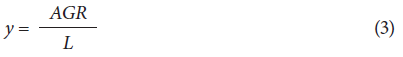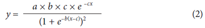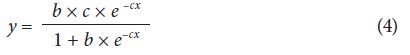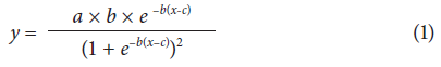 where, y is the absolute rate of stem growth, a is the maximum final dimension, b is day on which the highest growth rate occurs, c is the relative rate of growth at the inflection point, x is time in weeks and L is stem length.