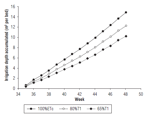 The total volume of water applied to treatments T1, T2 and T3 was 15.04, 12.39 and 10.35 m3 per bed, respectively, in the two cycles, which is equivalent to 3.64, 2.99 and 2.51 mm per day, respectively (Fig. 1). The reductions in the volume of water applied to T2 and T3 compared to T1 were 17.6% and 31.2%, respectively. The volumes were lower than those reported by Patiño (2000) who stated that the irrigation volume must range between 3.70 and 5.29 mm per day.