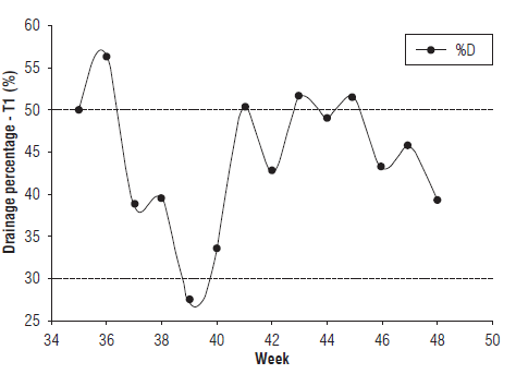 The mean daily values of the drained depth were 1.64, 1.00 and 0.82 mm in T1, T2 and T3, respectively. The drainage percentage (%D) in T2 and T3 was similar, according to the daily average values, 44.30%, 32.83% and 31.09% for T1, T2 and T3, respectively. The %D was adjusted taking into account the preset interval to use the drainage percentage correction factor (DPF) (30-50%) in nine (9) of the fourteen (14) weeks, with averages of 44.30% and 41.60% for the %D and DPF of T1, respectively (Fig. 2). The %D was lower than those reported by Esmeral et al. (2011) in rose cv. Charlotte, resulting in 52.65, 63.17 and 63.14% for the three substrates, 100% for burnt rice husks (BRH), 65% for BRH + 35% coconut fiber and 35% for BRH + 65% coconut fiber, respectively. However, it was higher than those proposed by Arreaza (2000) and Meneses (2004) in this study the %D ranged from 5% to 20% for carnations planted in the substrate, and reported by Martínez and Roca (2011) 10 to 30%.
