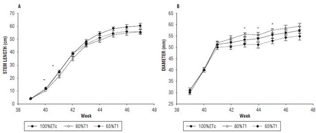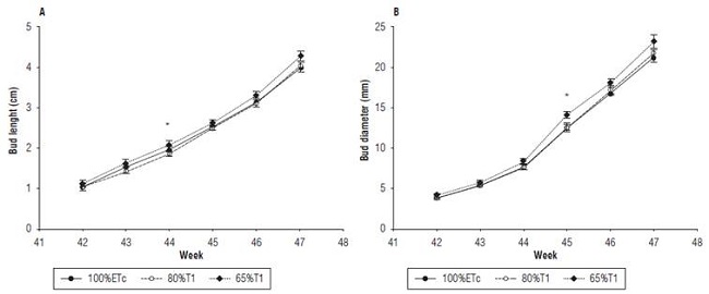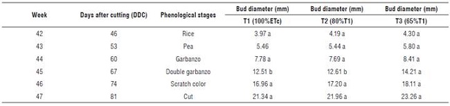 The length and diameter of the stem and bud did not show significant differences between treatments for the second cycle of measurements, because the stress was moderate and did not cause reductions in the quality of the flower; however, decreases in the length and diameter of the stem confirm what was found by Bolla et al. (2010), who stated that under unfavorable conditions of water availability and even with small decreases, there was a cessation of vegetative growth. Although the length of the stem found in the treatments ranged within the commercial requirements (50 to 60 cm for the Vendela variety), the shortest length in T1 influences the commercial value depending on the destination market.