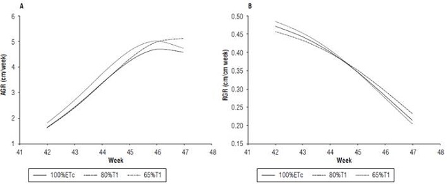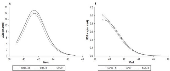 The curves from Table 3 fit the logistic model reported by Flórez et al. (2006). According to this logistic model, the larger stem growth length values during the second cycle were 59.74, 55.17 and 55.81 cm for T1, T2 and T3, respectively, achieving this growth after 41 weeks. The slope of the curve for T1, T2 and T3 was 1.008, 1.021 and 1.017, respectively. The growth time is represented by (t). The AGR of the flower stalk in the three treatments showed a typical trend of a bell curve (Fig. 5A), showing a steady growth, and reaching maximum values at week 42 (13.84, 13.13 and 12.37 cm for T1, T2 and T3, respectively). AGR values were zero in the phase of senescence to harvest. The T2 RGR showed a different behavior between weeks 39 and 40 but a similar trend was recorded after that period until harvest, were values ranged close to zero (Fig. 5B).